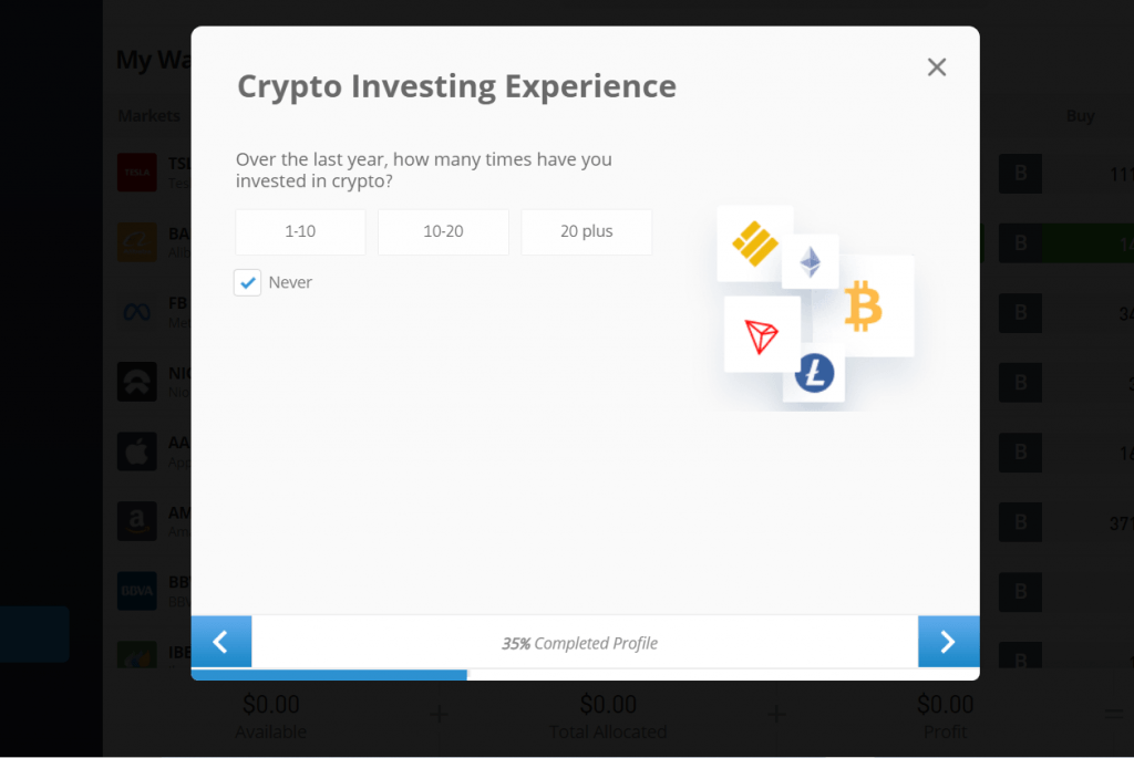 Now, with your profile created and completed you can actually start investing in etoro. The amazing thing about this platform is that you can invest in cryptocurrencies, stocks, and many other things. For example, on your dashboard, you can view many stocks available to be bought from many different companies. Then, it’s up to you to measure the risk and the guarantee of buying it. If you decide to invest in it, you can quickly view it on the platform (the ups and downs the stock goes through). This will increase your level of attention, in regards to what you must do with it. Therefore, as you can see, etoro has many tools that help you to stay up to date on your investments, keep you updated on promising opportunities, and many more. Thereby, you can fully trust this platform, due to its high level of accuracy and protection.