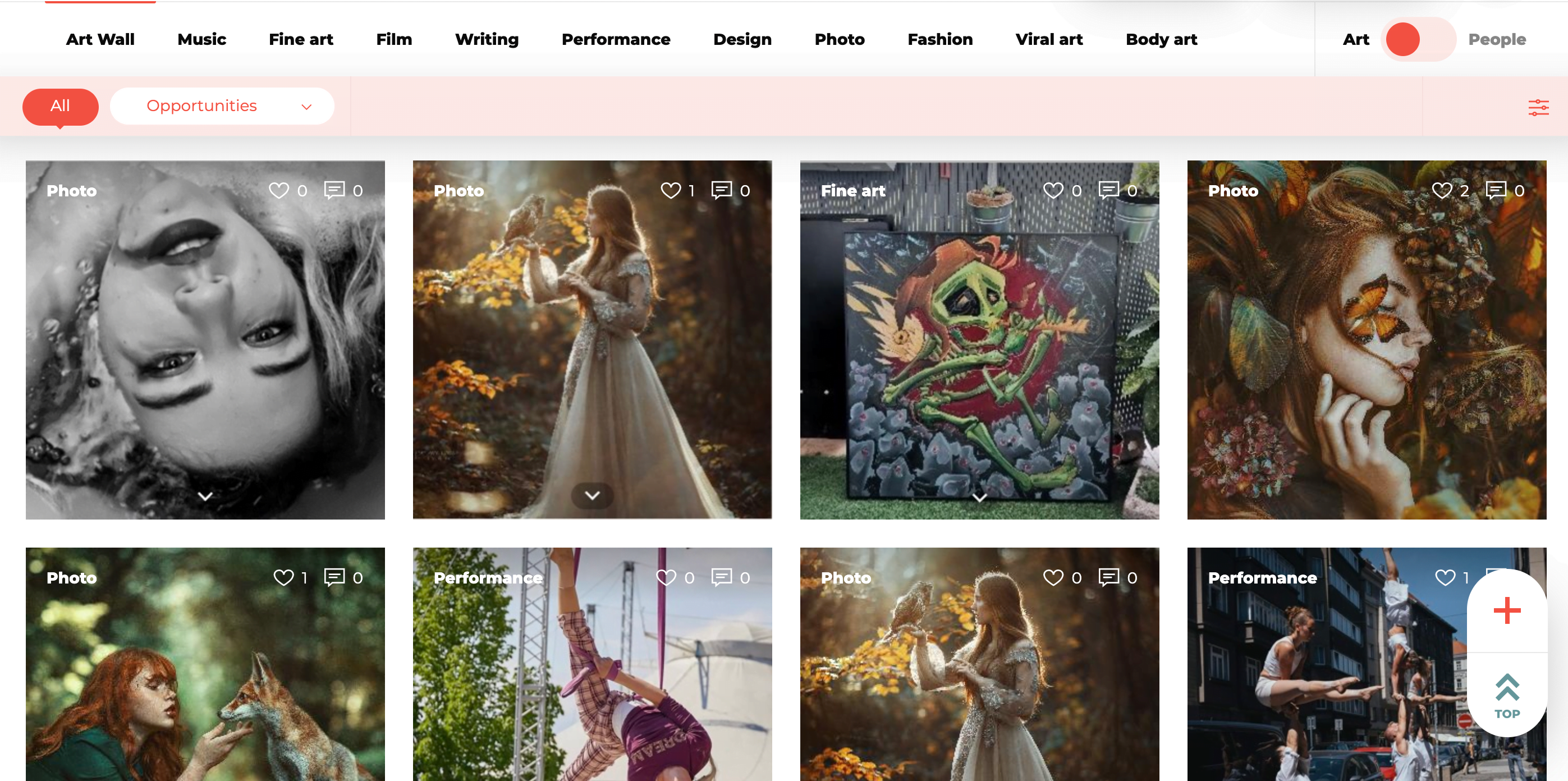 On the main menu, you can choose whether for Art or People as well as the category, if you click on the ART menu this will lead you to an art wall where you can see all the post from the relevant artist and each one will have the option to give a like (heart) or a comment and the judgements received.
