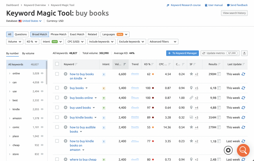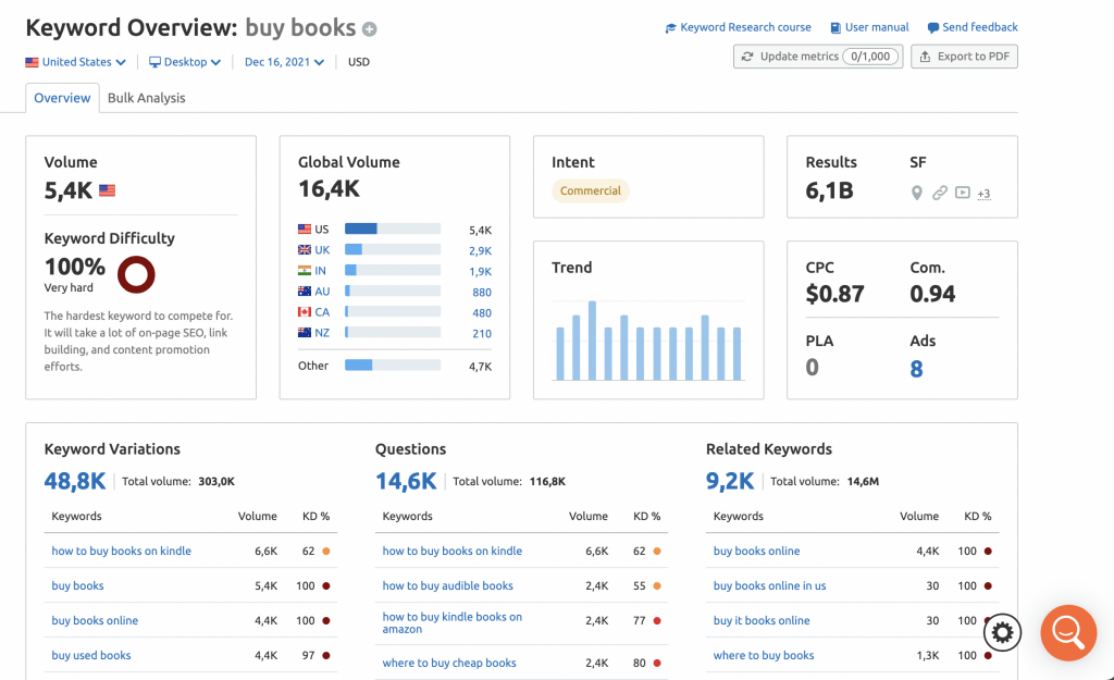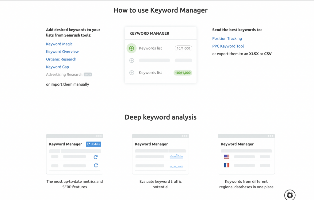 With this tool you will be able to collect your favorite keywords from across Semrush. Save your findings, get fresh metrics, and export your findings into an XLSX or CSV file or other Semrush tools.