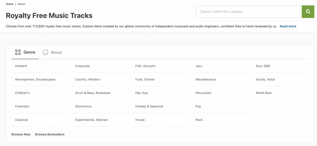 You might have heard about shutterstock as it’s one of the most famous platforms to find endless of background music, videos, photos and illustrations. Prices start around $49 for a standard license at $419 with a myriad of downloads. The site offers 60 thousand tracks so far that you can filter by genre, tempo, and ambient.